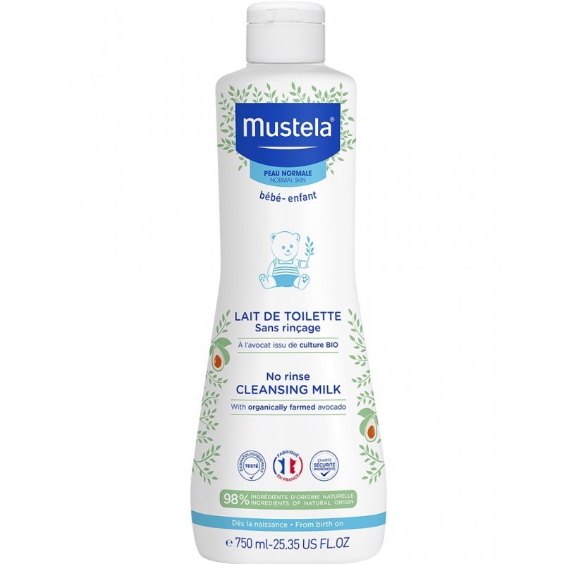 Mustela No-Rinse Cleansing Milk with Organic Avocado 750 ml gently cleanses the face and bottom of babies from birth, or children. It effectively eliminates impurities, promotes hydration and leaves the skin soft and supple. Its High Tolerance formula is made up of 98% natural ingredients.