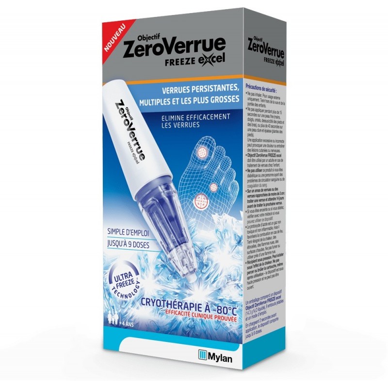 Mylan Objective ZeroVerrue Freeze Excel 14. 3 g is a rapid home treatment that effectively eliminates persistent, multiple and larger warts on the hands, arms and feet. It is the first home treatment based on nitrous oxide, a very cold gas. Thanks to Ultra Freeze Technology, it freezes the wart at -80°C and reaches the deepest layer of the wart. It's a medical device with cutting-edge technology that's quick and easy to use. The treatment is suitable for adults and children over the age of 4.