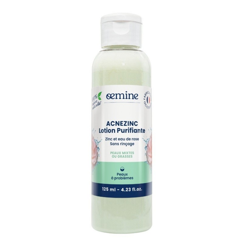 Oemine Acnezinc Purifying Lotion 125 ml is a zinc and rosewater-based lotion for oily, blemish-prone or acne-prone skin. Based on very gentle, astringent rosewater made from Centifolia or Damask rose. This emollient rose has always been recommended for fragile and oily skin.