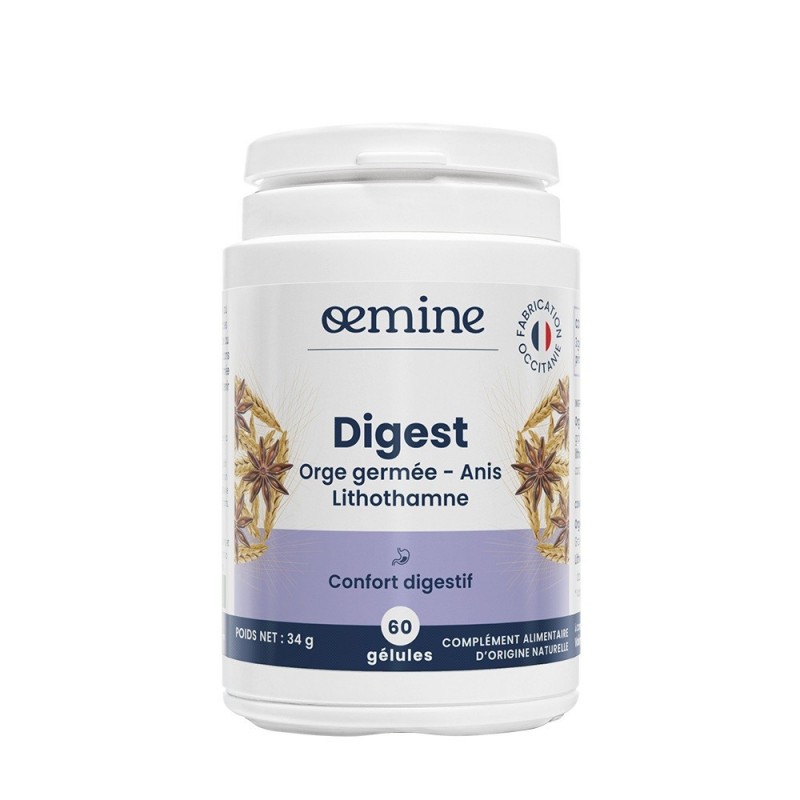 Oemine Digest 60 Capsules is a dietary supplement useful for ensuring better digestion and maintaining a flat belly. Eating too quickly, not chewing properly, very often leads to poor digestion. Lack of saliva can also cause digestive problems due to a lack of enzymes (amylase). To alleviate this, we offer Oemine Digest, a supplement that ensures better digestion, and consequently the maintenance of a flat belly. The calcium in this dietary supplement contributes to the normal functioning of digestive enzymes. It ensures good alkalinity in the digestive tract. The germinated barley in Oemine Digest completes this action. It was in barley germ that enzymes such as amylse (the main enzyme in digestion) were first discovered. Star anise is also reputed to aid digestion. This is why it is very often found in cooking associated with dishes that are heavy to digest