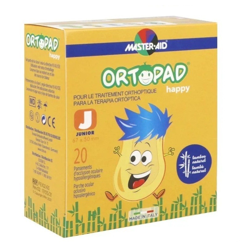 Ortopad Happy Junior is an occlusive eye patch for orthoptic care. Ortopad Happy is made from a pure cotton non-woven fabric. Soft, pore-free and breathable surface for maximum comfort. The new anatomical shape with slits ensures a perfect fit to the face, especially around the nose. Very thin, soft and absolutely opaque central lining. New reinforced hot-melt adhesive.
