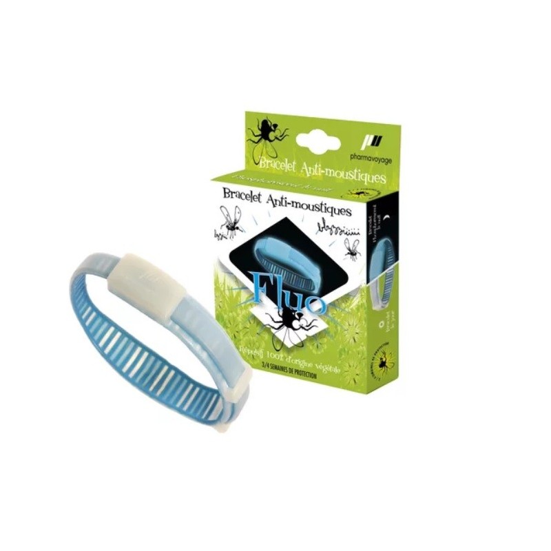 Pharmavoyage Anti-Mosquito Bracelet Blue Fluo is impregnated with a repellent of plant origin, geraniol, to effectively and immediately repel mosquitoes. The adjustable bracelet is suitable for adults and children aged 30 months and over. It offers protection for 3 to 4 weeks, with 3 to 4 hours' use a day. Fluorescent blue, the bracelet glows at night so you can enjoy outdoor activities. It is also waterproof to provide protection during your nautical activities.