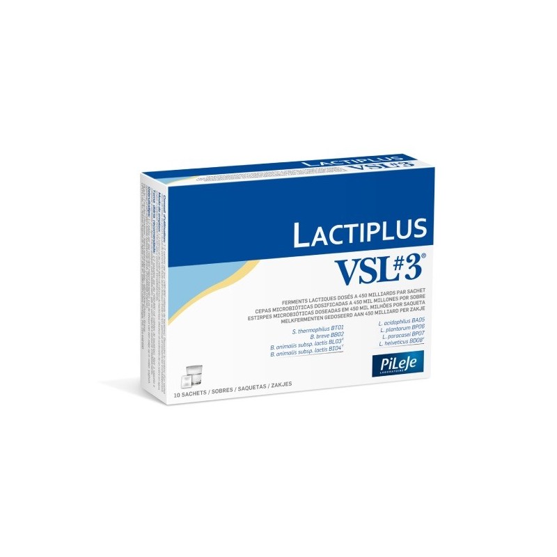 Pileje Lactiplus VSL#3 10 Sachets is a dietary supplement containing 8 microbiotic strains.