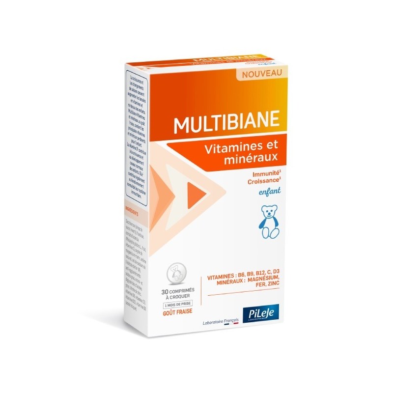 Pileje Multibiane Enfant Vitamins and Minerals 30 Chewable Tablets is specially formulated for children aged 3 and over and designed to balance their intake of essential micronutrients. Vitamin D contributes to growth, normal bone development and the normal functioning of children's immune systems. Pileje Multibiane Enfant Vitamins et Minéreaux is a dietary supplement based on magnesium, iron, zinc, vitamins B6, B9, B12, C, D3.
