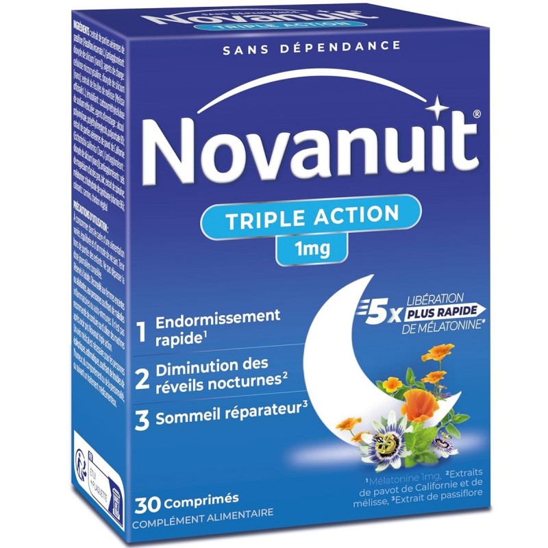 Sanofi Novanuit Triple Action 30 Tablets is a dietary supplement for adults only, with a triple action on sleep. It has: