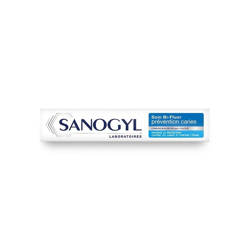 Sanogyl Bi-Fluor Care Decays Prevention 75 ml is a toothpaste with exclusive 3-in-1 technology, dedicated to people wishing to prevent the appearance of cavities while strengthening their enamel. Its formula, with Bi-Fluor 1450 ppm complex and Calcium, helps protect against cavities, strengthens enamel and helps fight plaque.