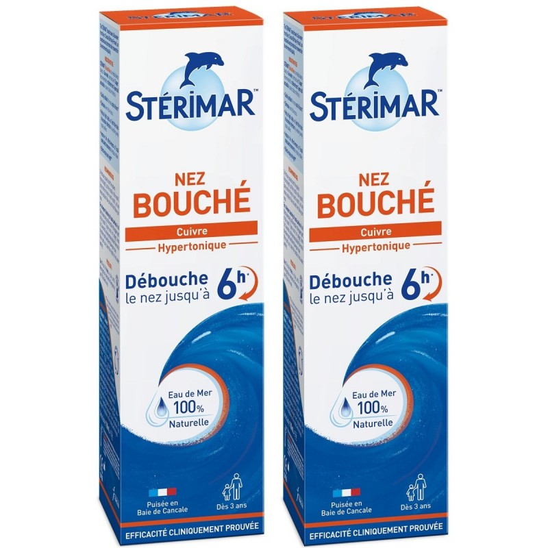 natural hypertonic filtered seawater solution, enriched with copper and manganese and preservative-free. Rich in marine minerals and trace elements, particularly copper and manganese, Stérimar Blocked Nose helps prevent infections and allergies. Seawater: 75%, Purified water: 25%, copper and manganese salts.