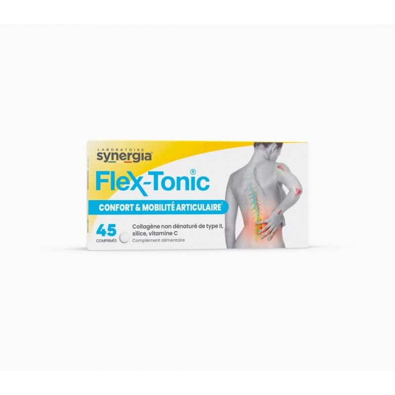 Synergia Flex-Tonic 45 Tablets is an exclusive synergy of a patented type II collagen and silica. The associated vitamin C contributes to collagen formation to ensure normal cartilage function.