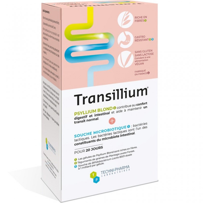 Techni-Pharma Transillium 100 Capsules is a dietary supplement based on blond psyllium and microbiotic strain. It participates in digestive and intestinal comfort and acts on the intestinal microbiota.