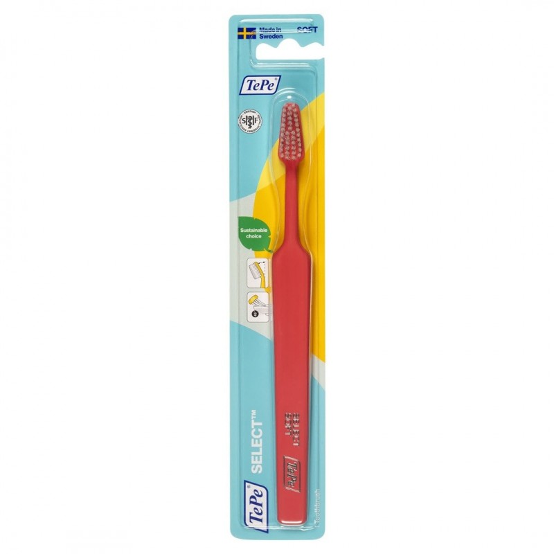Tepe Select Toothbrush Soft is a manual toothbrush in a classic format, adapted to everyone's needs. This ergonomic brush has a triangular head with very soft bristles and rounded tips, for easy access and optimum cleaning of the entire dentition. Colours and patterns subject to availability.