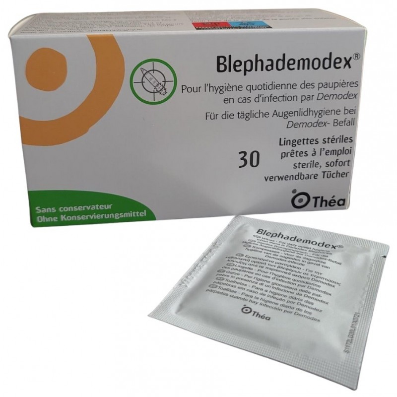 Théa Blephademodex 30 Wipes are sterile, ready-to-use wipes recommended for eyelid hygiene in cases of Demodex infection.