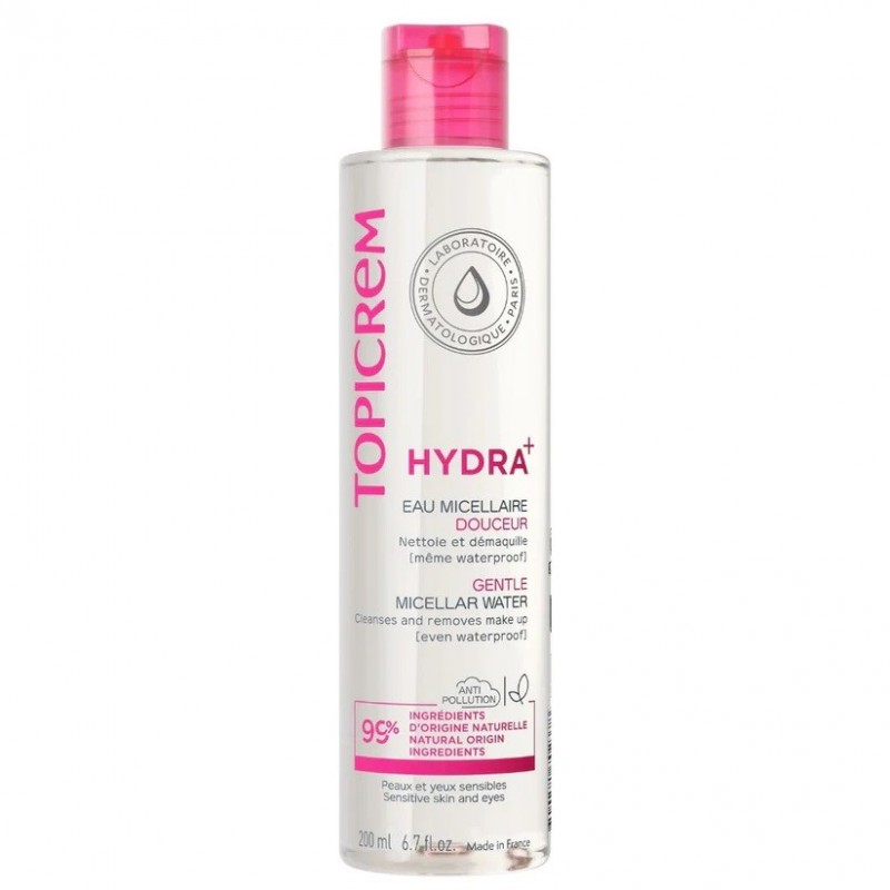 Topicrem HYDRA+ Gentle Micellar Water 200 ml gently cleanses and removes make-up from the face and eyes of the whole family's sensitive skin. Specifically formulated for the whole family's sensitive skin. Enriched with glycerine, Topicrem HYDRA+ Gentle Micellar Water cleanses, removes make-up and leaves skin clean and soft. High safety standards: formula developed for babies and children, tested under paediatric supervision, hypoallergenic, paraben-free, dye-free. Tested under dermatological and ophthalmological control and on contact lens wearers. Can be used on baby's bottom.