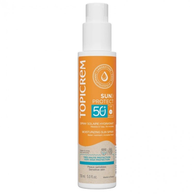 Topicrem Sun Protect Moisturizing Sun Spray SPF50+ 150 ml provides sun protection for the whole family's sensitive skin from the age of 3. It provides very high protection thanks to organic sunscreens with a broad UVA/UVB spectrum. It helps prevent photo-ageing and moisturises the skin for 8 hours. This sunscreen spray SPF50+ envelops the skin in a delicious sun-kissed fragrance with notes of peach and frangipani flower, for a real moment of well-being on application. Its light, fluid texture spreads easily and penetrates quickly to leave an invisible, non-greasy, non-sticky finish with no white marks. It's a texture that the whole family will love applying. The sunscreen spray is water, sand and sweat resistant.