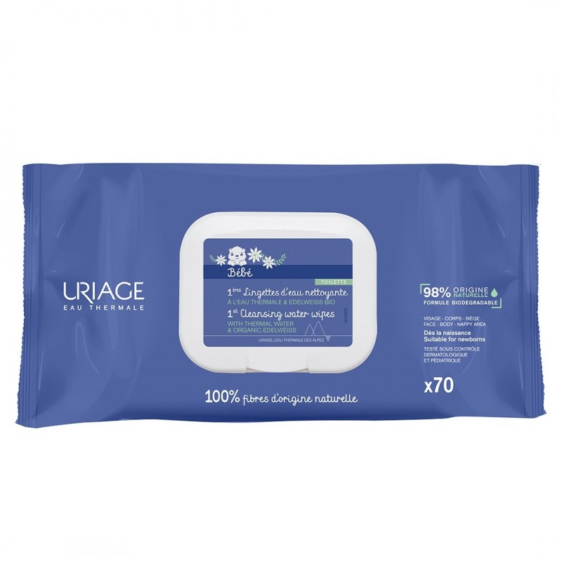 Uriage Bébé 1st Cleansing Water Wipes 70 Wipes, with Eau Thermale d'Uriage, gently cleanse the delicate skin of babies without the risk of irritation.