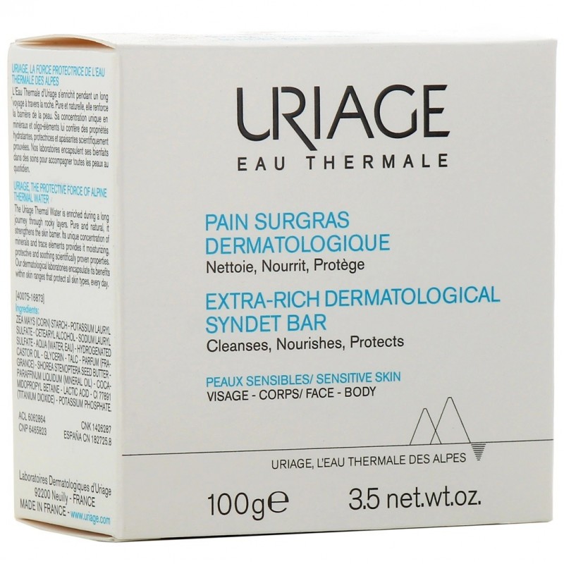 Uriage Extra-Rich Dermatological Syndet Bar 100 g. Delicately scented, this dermatological bar cleanses the skin without drying it out, preserving the hydrolipidic film. The Pain Surgras Uriage leaves the skin clean and soft.