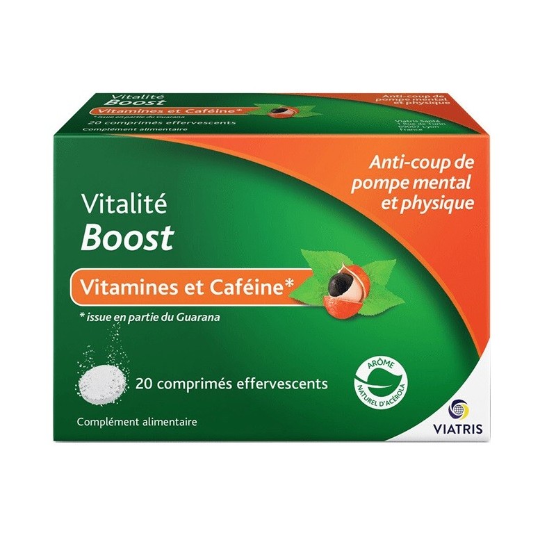 Viatris Vitality Boost 20 Effervescent Tablets are dietary supplements that contain vitamins and caffeine. Caffeine, partly derived from guarana, and vitamin C reduce temporary mental and physical fatigue. Vitamin B5 contributes to normal intellectual performance. Aspartame-free.