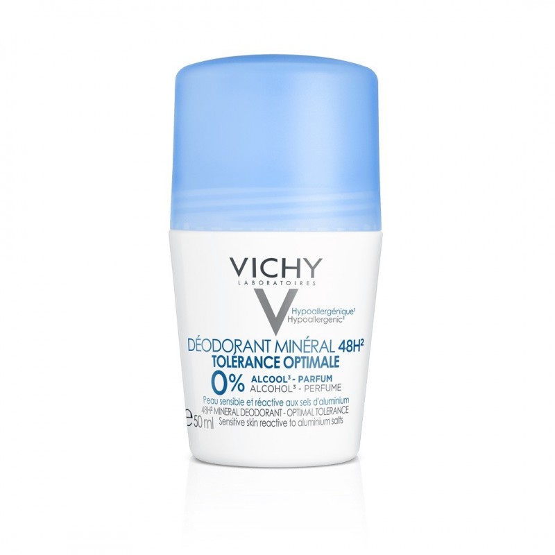 Vichy 48H Mineral Deodorant Optimal Tolerance Roll-On 50 ml is a deodorant indicated for skin that is sensitive and reactive to aluminium salts. It moisturises and soothes the most fragile underarms, even when shaved or depilated. It contains a combination of zinc gluconate and the 15 minerals in Vichy Thermal Spring Water for anti-odour action for up to 48 hours, plus soothing pro-vitamin B5. Hypoallergenic. Formulated to minimise the risk of allergies. Alcohol-free. Fragrance-free, aluminium salt-free.