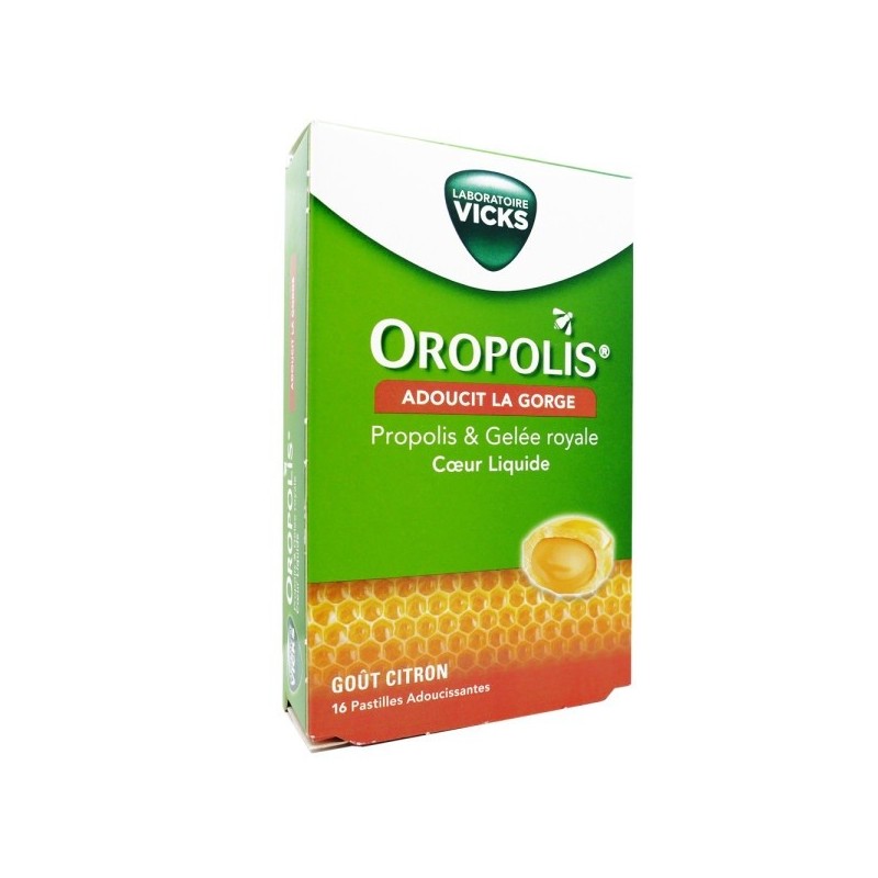 Vicks Oropolis Liquid Heart Lemon 16 Lozenges soften the throat. The lozenges contain a liquid heart concentrated in propolis, surrounded by a propolis-based shell: two textures for a double sensation and a soothing action for the throat!