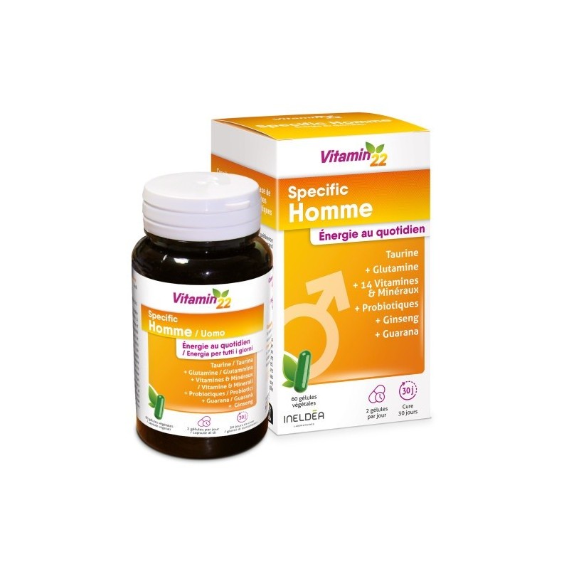 Vitamin'22 Specific Men 60 Capsules has been developed to provide the body with naturally effective active ingredients. It is ideal for all men who wish to begin a basic course of treatment specially adapted to their body in order to regain tone and energy on a daily basis.