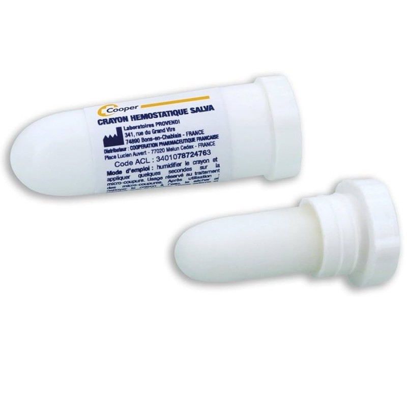 Salva Crayon Hémostatique est un bâtonnet contenant une substance hémostatique destiné à être appliqué sur la peau pour stopper les saignements dûs aux petites blessures et toutes petites coupures, notamment celles de rasoir.