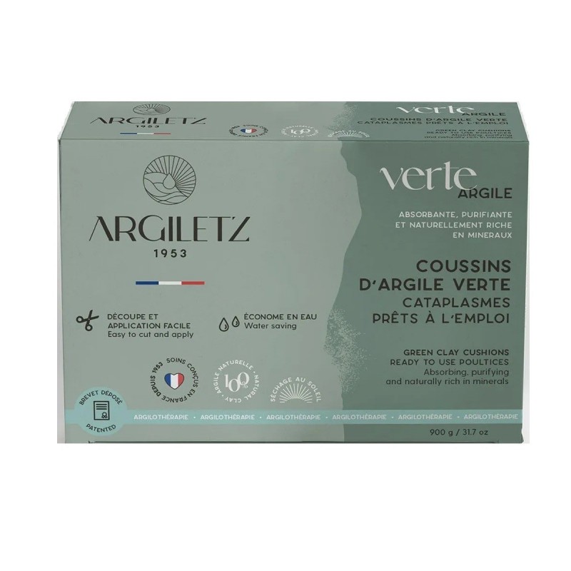 Argiletz Coussin d'Argile Verte 900 g, prêt à l'emploi. Idéal pour les sportifs, les curistes, en soins détoxifiants et relaxants, ces coussins d’argile verte ont été élaborés avec le plus grand soin et toute l’expérience d’Argiletz pour agir aussi rapidement qu’efficacement sur les muscles fatigués ou endoloris. Très pratique à utiliser, même en cas d’urgence, il se découpe facilement pour s’adapter à chaque partie du corps. Le Coussin d'Argile Verte Argiletz vous procure une véritable sensation de bien-être délicieusement réparatrice.