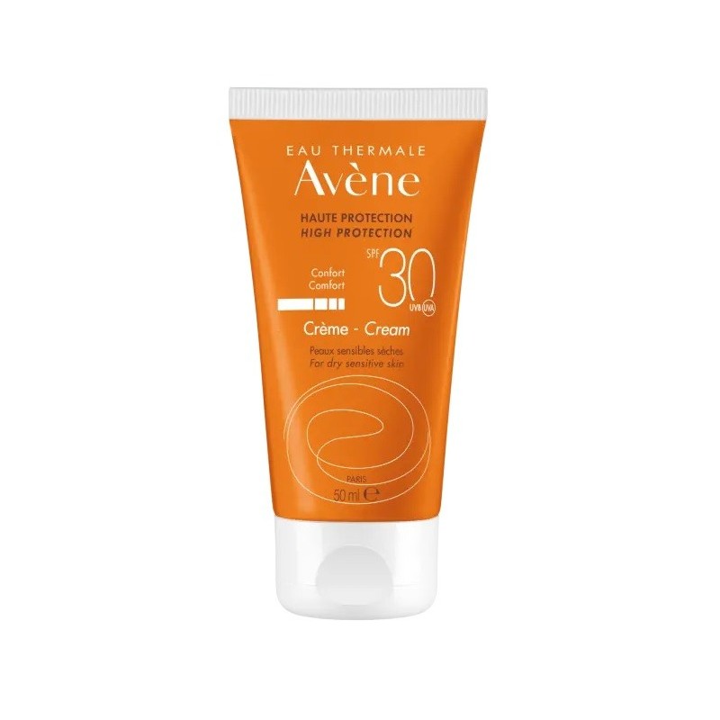 Avène Crème SPF 30 50 ml. Sans effet blanc. Haute protection solaire de la peau sensible sèche du visage. Résistant à l’eau. Large protection UVB-UVA. Photostable. Sans paraben.