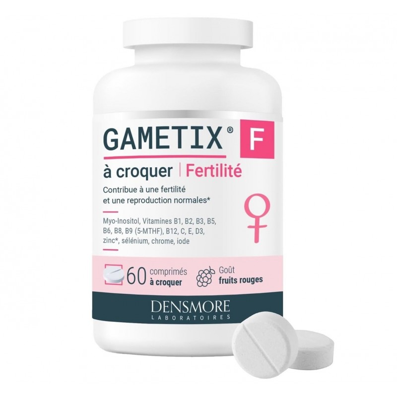 Densmore Gametix F 60 Comprimés à Croquer est une formule complète pour soutenir la fertilité féminine, à de base de myo-inositol, d'acide folique 5-MTHF Quatrefolic, de vitamines et minéraux. Il soutient la qualité ovocytaire et aide à protéger les cellules, dont les ovocytes, contre le stress oxydatif. Il contribue à réguler les cycles menstruels et favorise une fonction thyroïdienne normale.