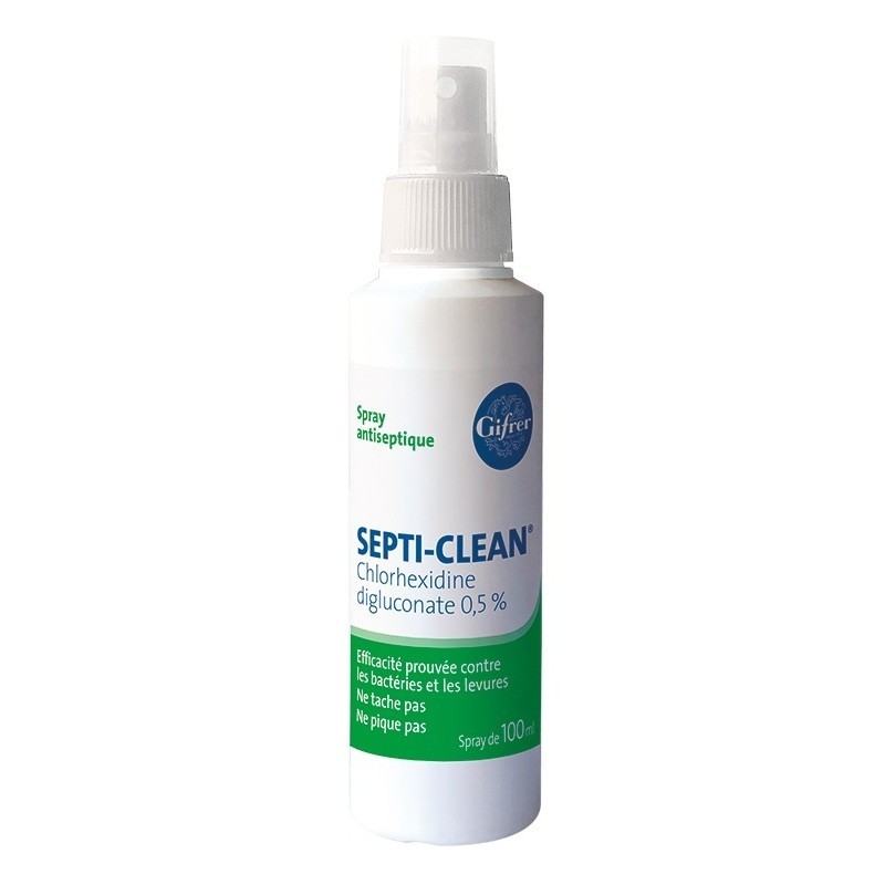 Gifrer Septi-Clean Spray Antiseptique 100 ml à base de chlorhexidine digluconate est efficace contre les bactéries et les levures. Le produit agit comme un antiseptique à usage cutané. Indiqué pour la désinfection de la peau saine. Il désinfecte la peau avant tout type d’intervention. Efficace contre les bactéries et les levures selon les normes EN1276, EN1650. Ne tache pas. Ne pique pas.