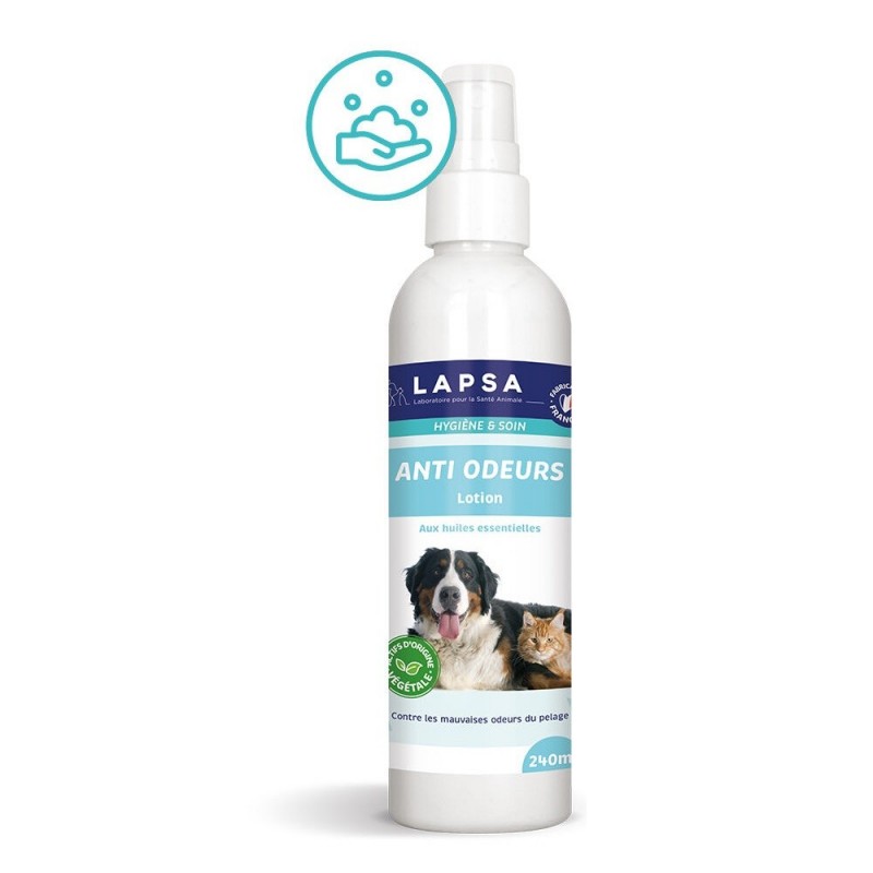 Lapsa Lotion Anti Odeurs 240 ml est un spray pour neutraliser les mauvaises odeurs du chien ou du chat. À base d’huiles essentielles, elle laisse le pelage doux et respecte la peau. Aux extraits d'eucalyptus, menthe, romarin et térébenthine.