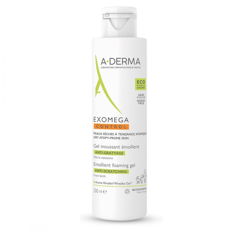 Aderma Exomega Control Gel Moussant Émollient Anti-Grattage 200 ml nettoie en douceur, apaise et protège les peaux sèches à tendance à l'eczéma atopique dès la naissance. Véritable hygiène-soin, sa formule a été développée avec les mêmes actifs que les soins émollients Exomega Control pour protéger et apaiser ces peaux fragiles.