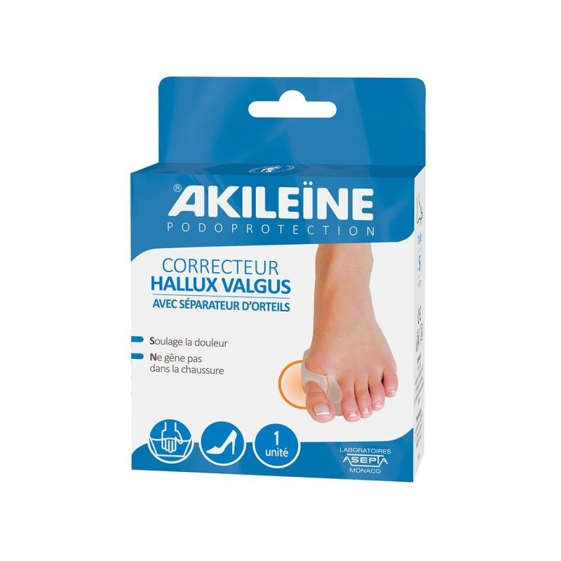 Akileïne Podoprotection Correcteur Hallux Valgus avec Séparateur d'Orteils soulage la douleur en limitant le frottement et la pression de la chaussure sur l'oignon. Ne gêne pas dans la chaussure.