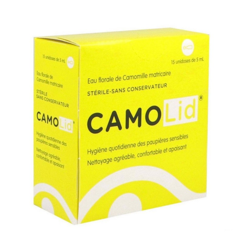 Camolid Eau Florale de Camomille Matricaire 15 x 5 ml offre un nettoyage agréable, confortable et apaisant pour les paupières sensibles.