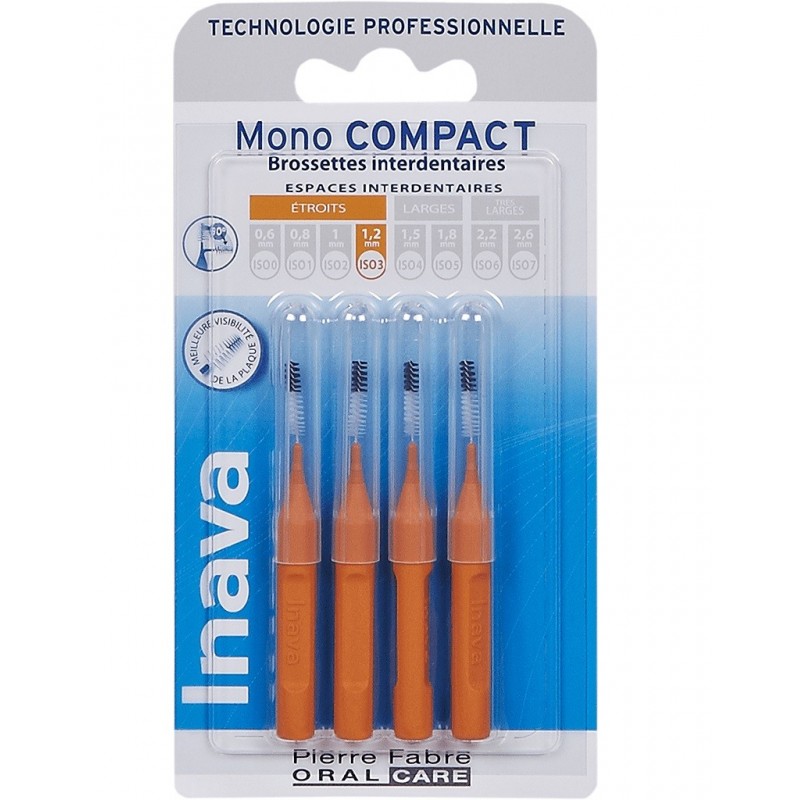 Inava Mono Compact 4 Brossettes Interdentaires Orange 1,2 mm nettoie les espaces interdentaires. Techniques, précises et faciles d'utilisation : les brossettes interdentaires Inava Mono Compact et leurs 2 diamètres de brins facilitent le nettoyage interdentaire des espaces difficiles d'accès. Conçues pour un nettoyage interdentaire efficace, les brossettes interdentaires Inava Mono Compact complètent les gestes d’hygiène bucco-dentaire quotidiens et sont particulièrement recommandées aux personnes porteuses d’implants, d’appareils orthodontiques ou dont les collets dentaires sont dénudés. Leur utilisation permet de réduire la formation de la plaque dentaire, responsable de caries et de gingivites, et consiste en une simple insertion délicate, suivie de quelques va-et-vient. Les brins noirs de la brossette, en contraste avec la blancheur des dents, en facilitent l’insertion et permettent d’observer les dépôts ôtés. Les brins blancs, quant à eux, signalent les saignements occasionnels. Il suffit ensuite de nettoyer la brossette (à l’aide d’un peu de bain de bouche, par exemple) et de la ranger pour une utilisation ultérieure. Afin de ne pas forcer l’insertion interdentaire, le choix de la taille de la brossette est primordial. La gamme est donc composée de 8 références allant de la plus fine (ISO 0) à la plus large (ISO 7), reconnaissables à leurs différentes couleurs et proposées par paquet de 4.
