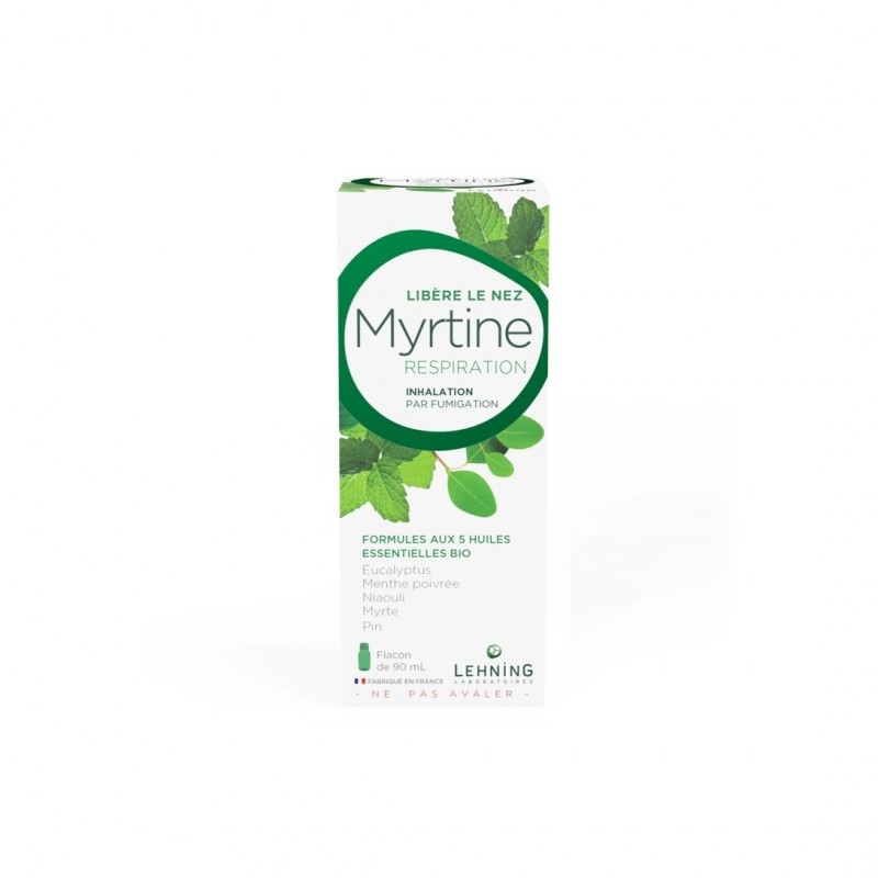 Lehning Myrtine Respiration 90 ml associe 5 huiles essentielles pour humidifier et libérer le nez. Après inhalation et en suivant les instructions d’utilisation, votre nez est assaini et vous respirez plus aisément. Les huiles essentielles d’eucalyptus, de menthe poivrée, de niaouli, de myrte et de pin sont reconnues pour leur action soulageant les nez bouchés.