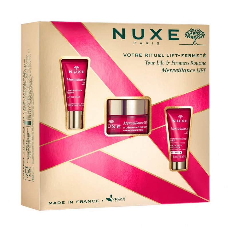 Nuxe Coffret Votre Rituel Lift Fermeté corrige vos rides et raffermit votre peau. Il est composé d'une crème de jour, une crème de nuit et une crème contour des yeux, toutes 3 issues de la gamme Merveillance Lift. Le coffret Merveillance Lift Nuxe proposé sur notre pharmacie en ligne contient :