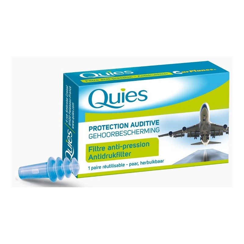 Les Protections Auditives Spécial Avion Quies préviennent les douleurs au niveau du tympan causées par ces changements de pression. En silicone souple, elles renferment un filtre en céramique qui favorise un échange progressif de l’air sur plusieurs minutes. Le tympan s’adapte peu à peu à la nouvelle pression, sans subir un choc. Ce procédé breveté a été mis au point avec l’aide des pilotes de l’US Navy.