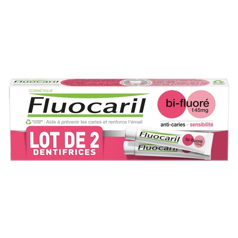 Fluocaril Dentifrice Bi-Fluoré Dents Sensibles 145mg 2 x 75 ml aide à prévenir les caries et soulager la sensibilité dentaire.