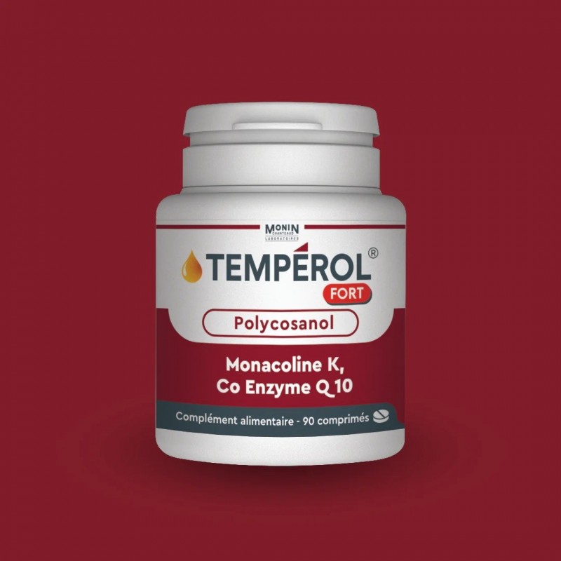 Monin Chanteaud Tempérol Fort 90 comprimés est un complément alimentaire pour la régulation du cholestérol. Chaque comprimé contribue à un apport de 2,9 mg de monacolines de levure rouge de riz, 10 mg de policosanol et 20 mg de coenzyme Q10.