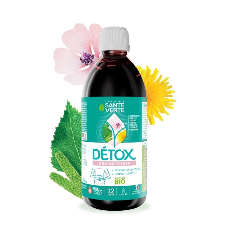 Santé Verte Détox Bio 500 ml est un complexe de plantes contenant des extraits végétaux reconnus pour leur action ciblée sur les 5 émonctoires : élimination des toxines et confort digestif.