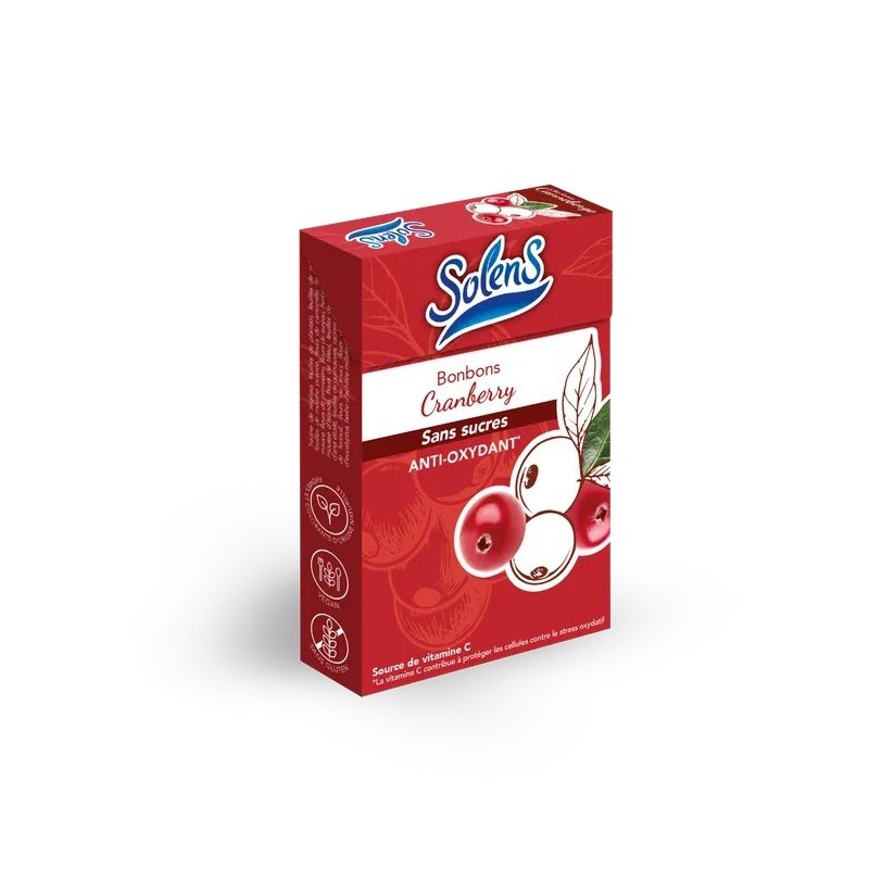 Solens Bonbons Cranberry Sans Sucres 50 g sont de délicieux bonbons sans sucres au jus de baies rouges de cranberry subtilement acidulés pour un maximum de plaisir.