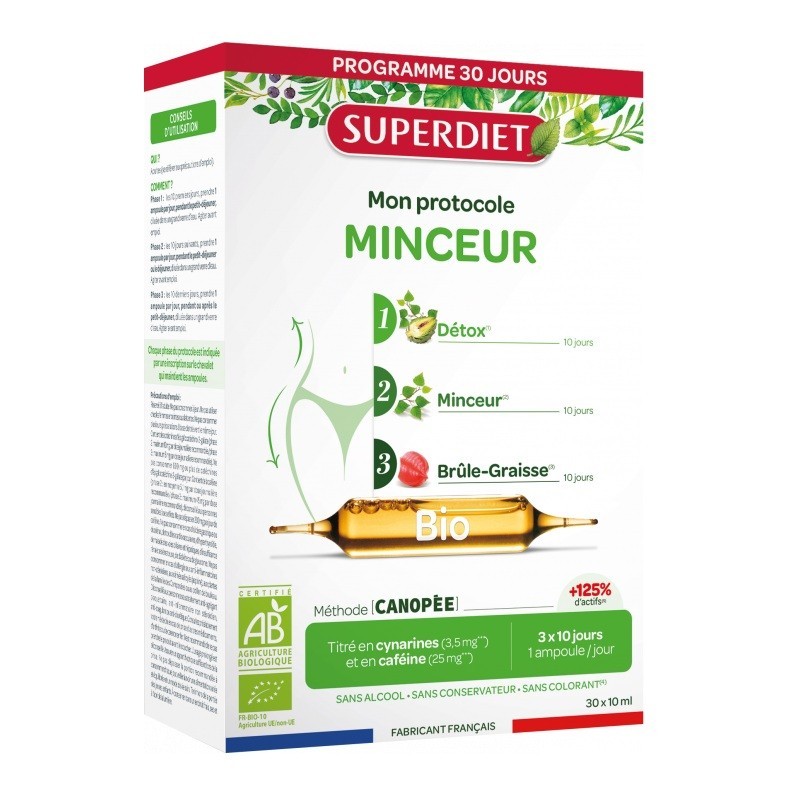 Superdiet Protocole Minceur Bio 30 Ampoules est un un programme minceur naturel en 3 étapes de 10 jours, qui associe 10 plantes bio dont le pissenlit qui participe au drainage, le thé vert qui aide au contrôle du poids, et la guarana pour une action brûle-graisse.