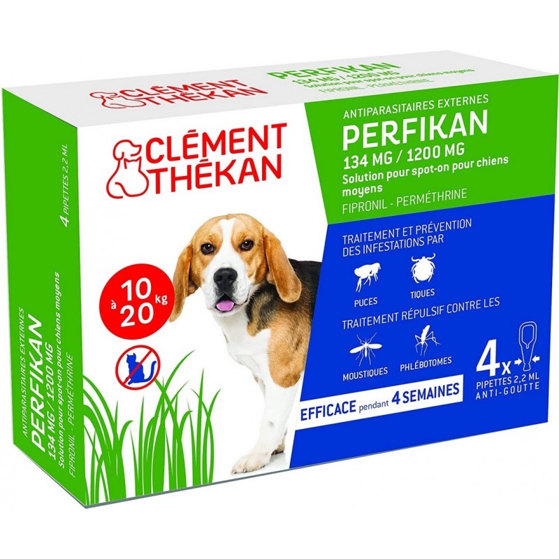 Clément Thékan Perfikan 134 mg/1200 mg Chiens Moyens 4 Pipettes est une solution antiparasitaire pour spot-on adapté aux chiens moyen de 10 à 20kg.