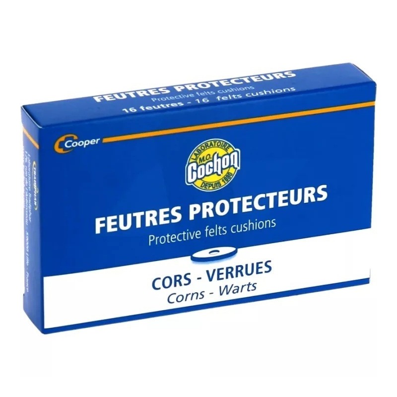 Cooper M.O Cochon Feutres Protecteurs Cors Verrues est une rondelle plate en non-tissé, adhésive ( adhésif hypo-allergénique ), destinée à stopper de façon instantanée les pressions douloureuses exercées par la chaussure sur le cor. Le cor est une masse de tissus morts souvent située sur les articulations des orteils.