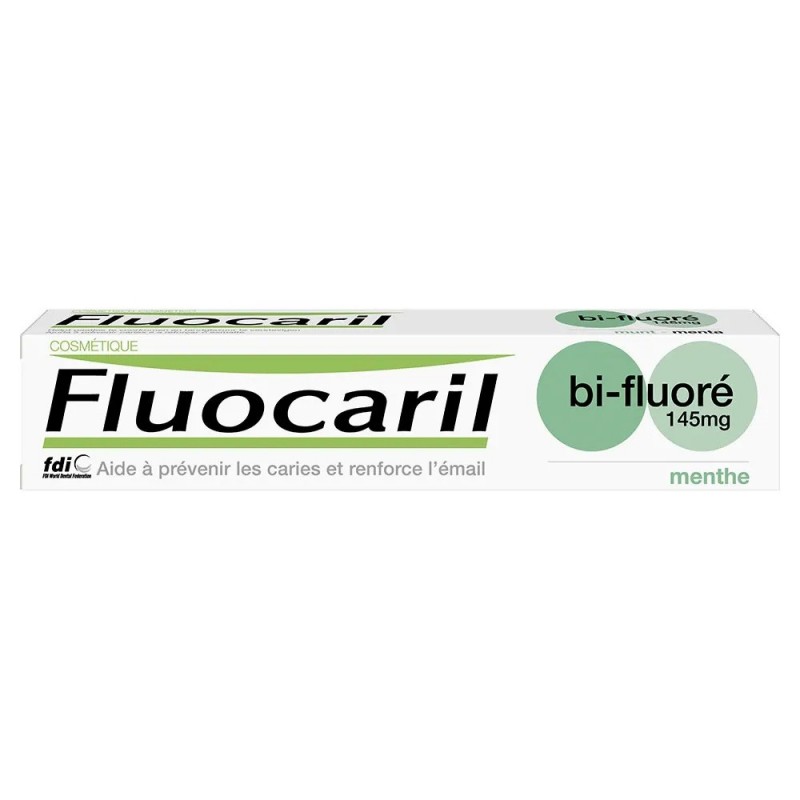 Fluocaril Dentifrice Bi-Fluoré Menthe 145mg 75 ml aide à prévenir les caries et renforce l’émail.