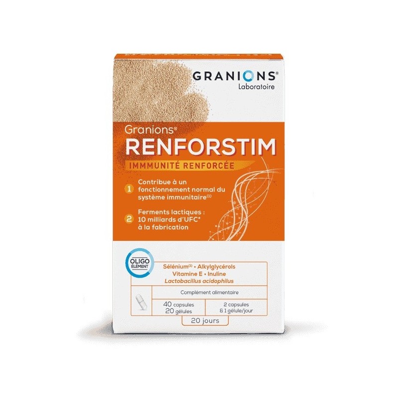 Granions Renforstim 40 Capsules + 20 Gélules contribue au bon fonctionnement immunitaire.