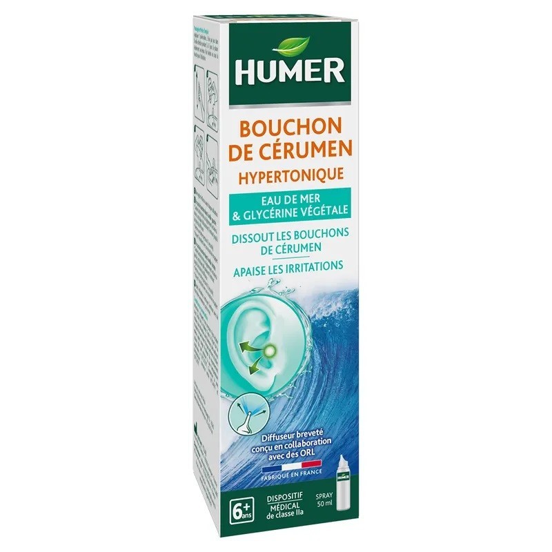 Humer Bouchon de Cérumen 50 ml est un spray utilisant les bienfaits de l’eau de mer hypertonique, permettant ainsi une dissolution efficace du bouchon de cérumen, la protection, la lubrification du conduit auditif ainsi que l’apaisement des irritations. Composé d’eau de mer hypertonique ainsi que de composants d’origine naturelle (glycérine végétale, eau) et sans conservateurs, il permet :