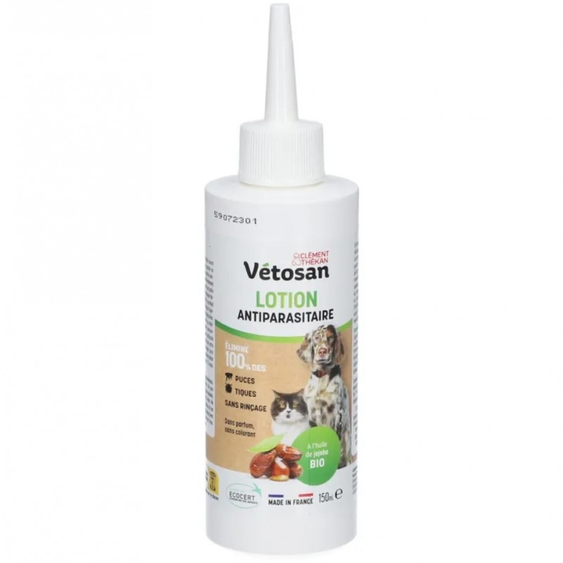 Clément Thékan Vétosan Lotion Antiparasitaire 150 ml est un soin spécialement conçu pour éliminer les puces et les tiques, à tous les stades de leur vie (adulte, larve et nymphe). Elle immobilise les parasites par leur action mécanique, permettant leur élimination lors du brossage. Grâce à l'huile de jojoba, la lotion permet de nourrir et d'hydrater la peau. Sa formule n'a pas besoin de rinçage.