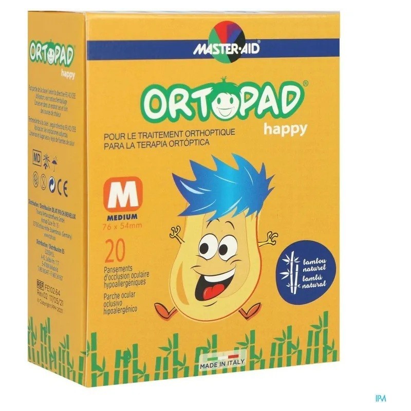 Ortopad Happy Medium est composé d’un non-tissé en cotton pur. Surface douce, sans pores et perméable à l’air pour un maximum de confort. La nouvelle forme anatomique avec fentes permet une adaptation parfaite au visage, surtout au niveau du nez. Garniture intérieure centrale très fine, douce et absolument opaque. Nouveau adhésif hot-melt renforcé.