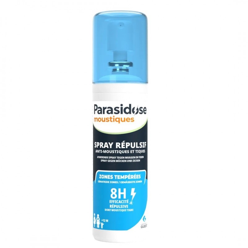 Parasidose Moustiques Zones Tempérées Spray Anti-Moustiques et Tiques 100 ml est un spray qui repousse efficacement les moustiques pendant 8h ainsi que les tiques pendant 12h. Il contribue à la prévention des maladies vectorielles transmises par les moustiques telles que le chikungunya, le paludisme, la fièvre jaune, la dengue, le virus Zika, ainsi que la maladie de lyme transmise par les tiques. Sa texture non grasse est rapidement absorbée par la peau. Testé sous contrôle dermatologique. Il convient aux peaux sensibles. Vaporisateur sans gaz. Biocide TP19 : Répulsif.