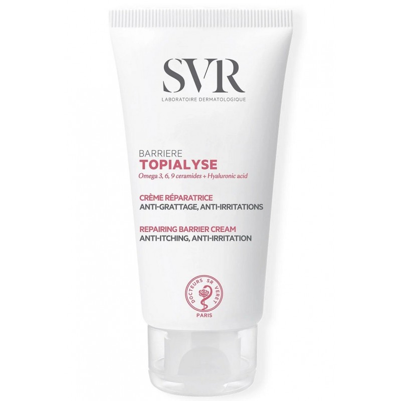 Svr Topialyse Barrière Crème Réparatrice 50 ml protège les peaux atopiques des agressions mécaniques ou chimiques dues aux détergents. Il apaise immédiatement les sensations de grattage et limite leur réapparition, accélère la réparation de la peau et forme un film barrière pour la protéger. Pour les peaux sèches à tendance atopique. Zones réactives, irritées et localisées: mains, visage, corps. Enfants et adultes.